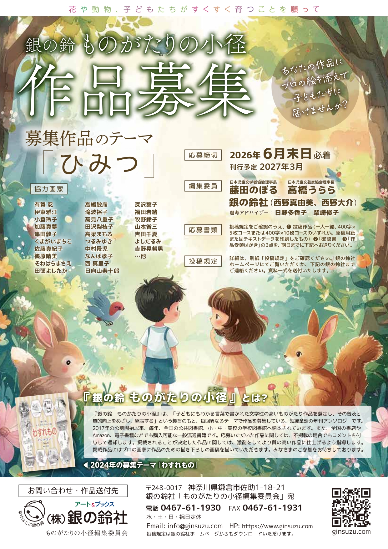 応募作品は一人一編のみ。 投稿規定をご確認の上、確認書へサインをいただき、銀の鈴社宛に郵送をお願い致します。(投稿規定・確認書専用の原稿用紙は弊社より郵送しますので、ご連絡ください。)